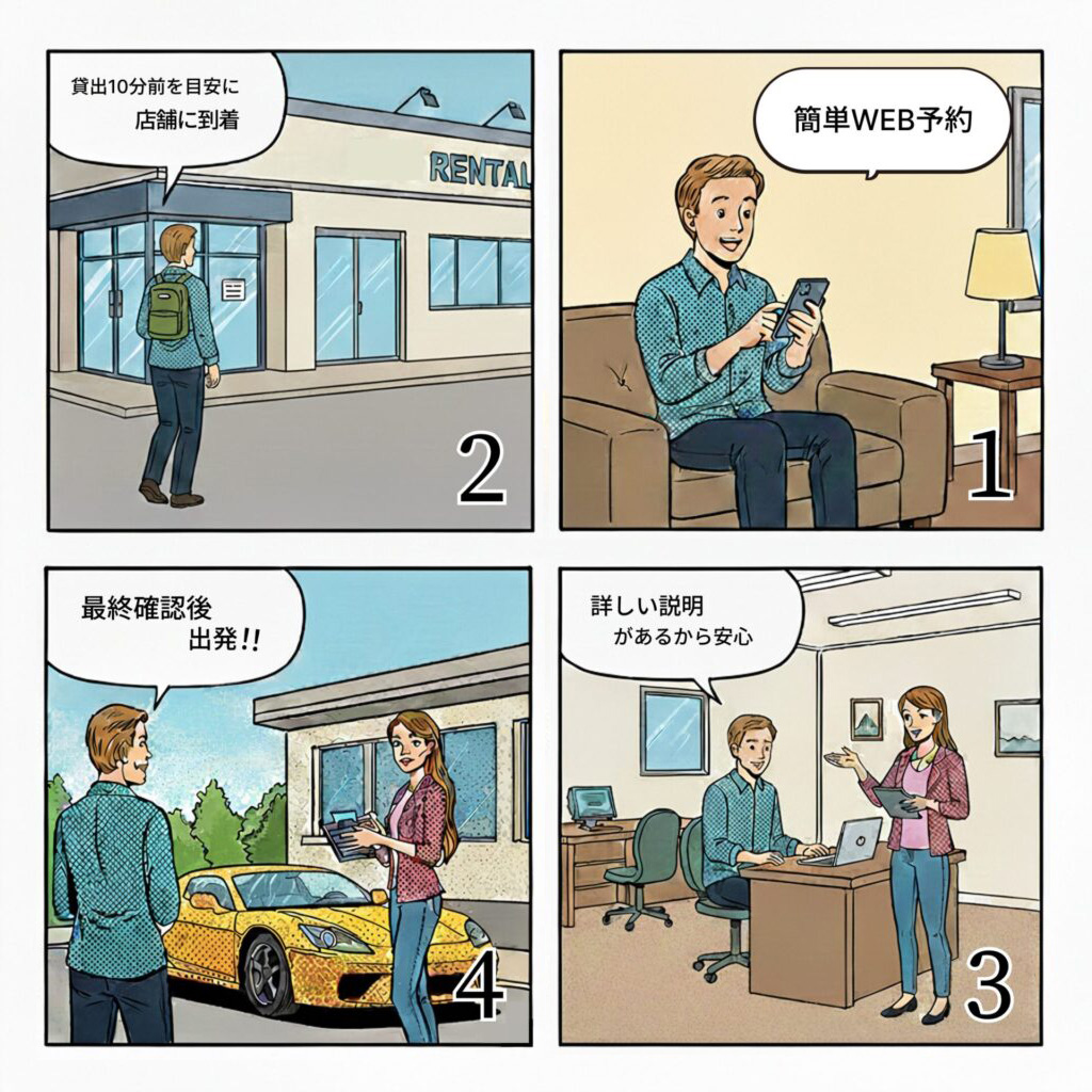 事前契約をいただいたお客様に限り、キーボックスを利用した非対面での貸出・返却が可能です。これにより、早朝や深夜といった営業時間外でもお客様のご都合に合わせてご利用いただけます。夜間・早朝対応をご希望の場合は、必ずご契約時までにスタッフへお申し付けください。