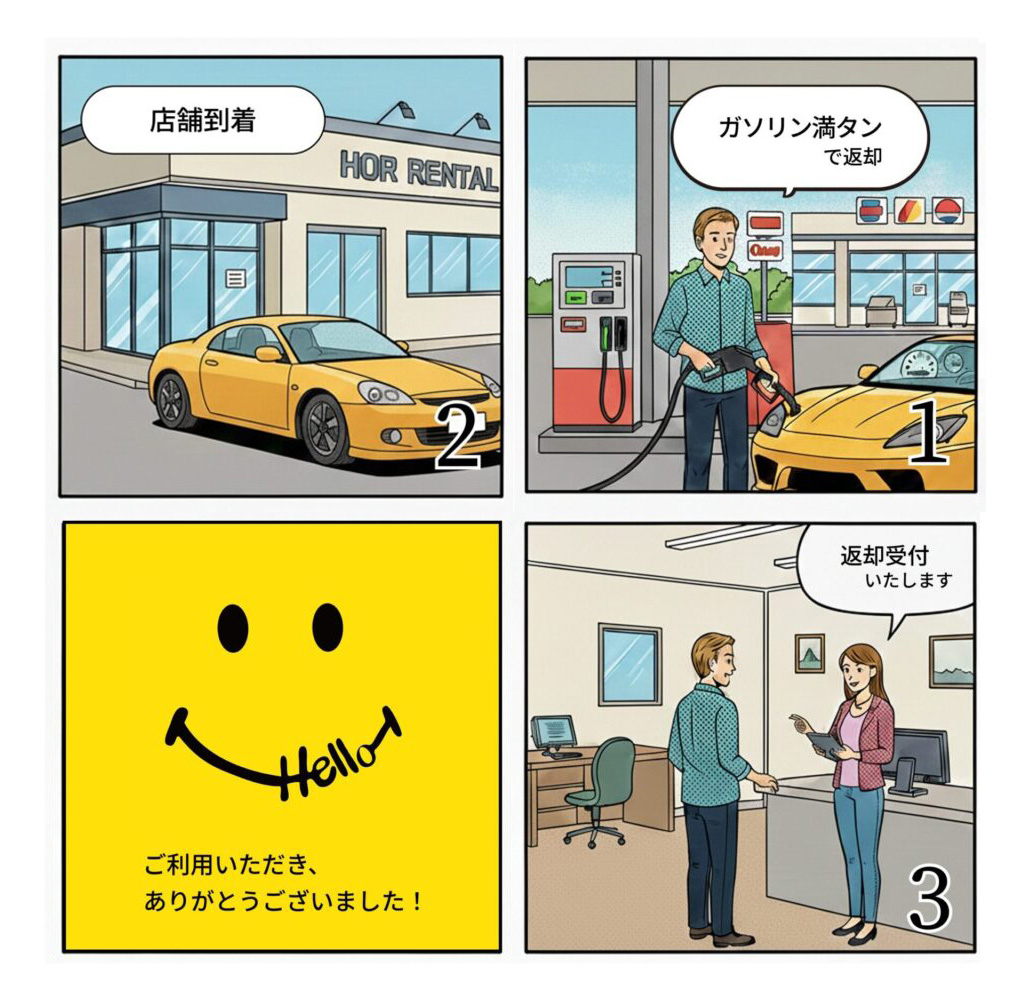 ご返却は、原則としてお借りいただいた場所に返却をお願いいたします。返却時の駐車場所についてご不明な点がございましたら、ご帰着前に店舗スタッフまでお電話いただけますとスムーズにご案内可能です。